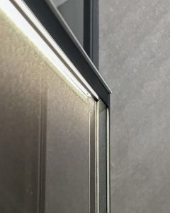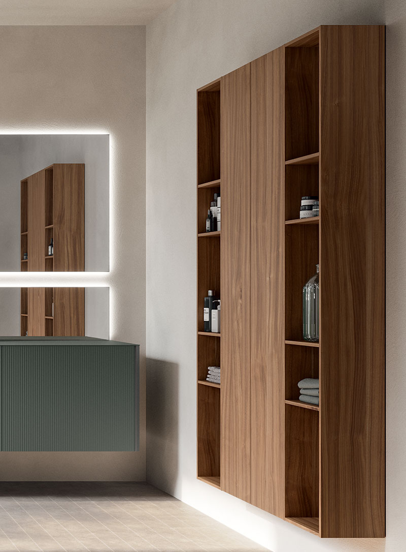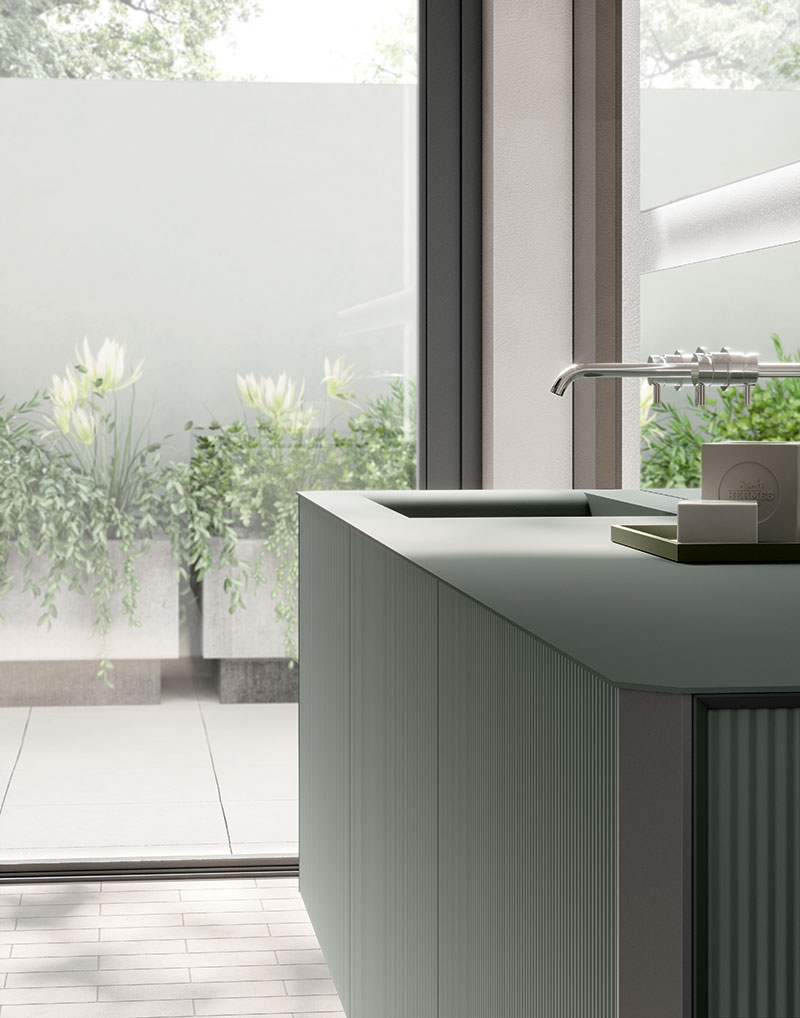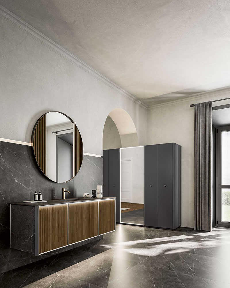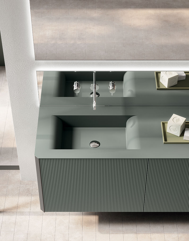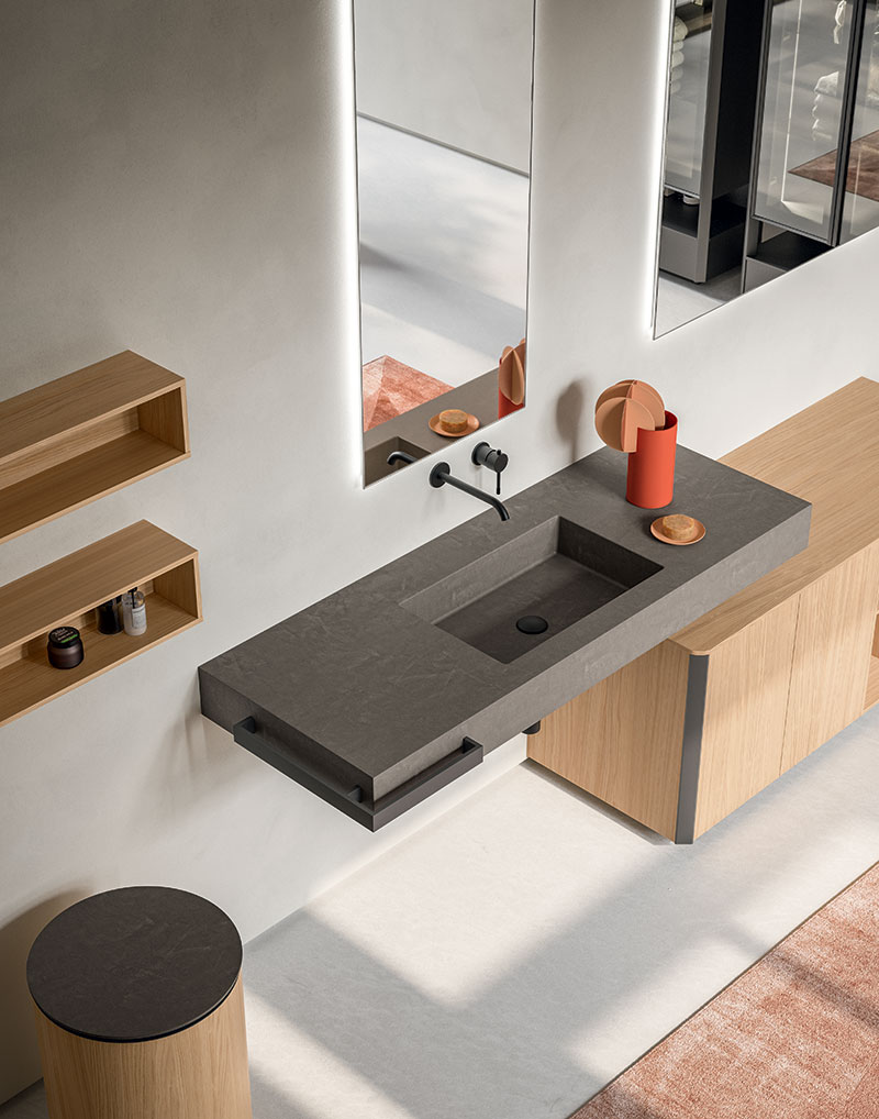 Base lavabo a terra i cui frontali si compongono dell’abbinata di cassettone in Resina Stone Deckblend Levanto su telaio in metallo Nichel, cassetto inferiore e ante laterali laccate opache colore a campione. Piano e lavabo da appoggio Speen 3 riprendono la finitura in Resina del frontale con telaio. Le linee geometriche della composizione sono ammorbidite dallo specchio Tondo 2 con circonferenza illuminata a LED. I portasciugamani da muro Line richiamano la finitura del frontale telaio e dei bordi del mobile.