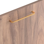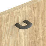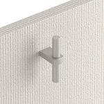 Base sospesa in nobilitato Miele con anta e doppi cassetti. Maniglia in finitura acciaio. Sulla base poggia il mensolone con lavabo integrato in HPL Pietra Balck & White. La gamba in metallo, finitura Nichel, fa da sostegno al mensolone e funge da pratico portasciugamano. Miscelatore Fill Nero opaco. Accessori bicchiere e dispenser Brio. Specchio Vela dall’originale forma a spicchio con luce integrata. A parete la collezione CartaBianca permette di creare una pratica armadiatura contenitiva che può essere sfruttata come porta-abiti con ante e cassettoni e per ottimizzare al massimo gli spazi grazie alle numerose dimensioni disponibili.