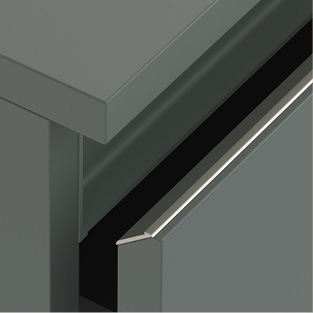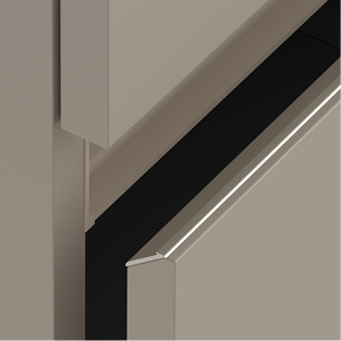 Giochi di geometrie per questa composizione Segno con cassettoni sospesi e sfalsati che alternano sui frontali il laccato opaco Canapa e Corda, entrambi con effetto 3D. L’asimmetria dei piani moltiplica i punti d’appoggio. Il piano con doppio lavabo integrato è in marmoresina colorata Grigio Olivastro (Ral 7002). Anche gli specchi retroilluminati giocano su geometrie di pieni e vuoti, con uno specchio Tondo e uno specchio Luna a semicerchio. La finitura dei miscelatori Fill 1 si abbina alla mensolina in metallo applicata tra specchio e parete.